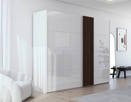 Dulap cu usi glisnate HALLE 218x210x59cm alb alpin/ alb lucios - oglinda, maner aluminiu