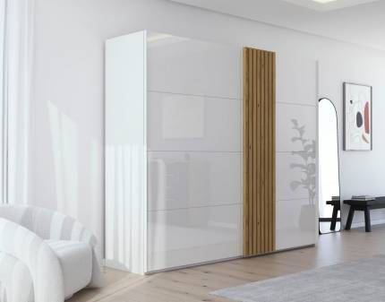 Dulap cu usi glisante TEGIO 262x223x69cm alb alpin/ sticla alba - stejar Wild